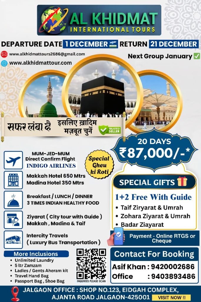 You can contact Asif Khan at 9370002686, 9420002686, or 9272002686. Alternatively, you can email at alkhidmattours2686@gmail.com or visit www.alkhidmattour.com.